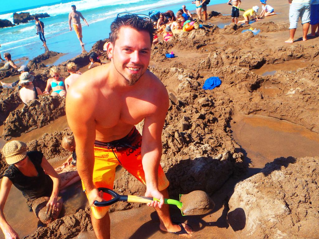 The day after, we did a trip to hot water beach on the Coromandel peninsula. Due to a geothermal field underneath the sand, the beach experience is certainly different. To enjoy it you have to find the right spot, get a spade, dig a hole and relax in your own private natural hot tub, until the flood destroys your hot heaven. You can only do that 2 hours before and after the low tide so you better be on time. When you go into the cold sea afterwards, you have to watch your step, because on some spots, the water is boiling and you can easily burn your feet – hot and cold at the same time :)